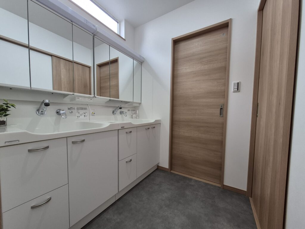 洗面室と脱衣室を分けることでプライバシーを確保するとともに、洗面台を2台並べて配置して、朝の忙しい時間に配慮されています。