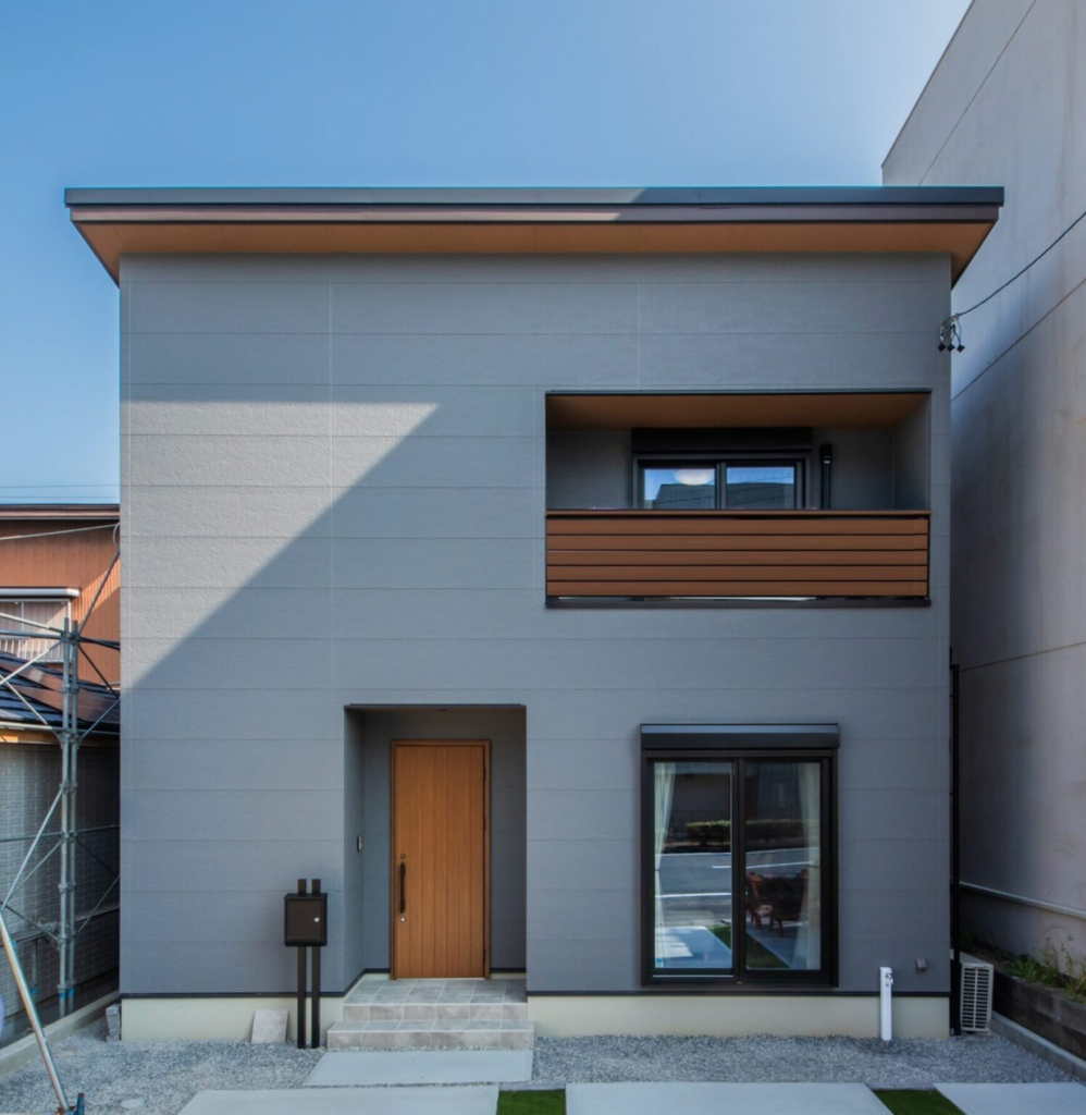 グレーを基調としたキューブ型の外観が印象的な、シンプルで洗練された住まいです。無駄をそぎ落としたデザインは街並みにもなじみやすく、長く愛せる佇まいに仕上がっています。