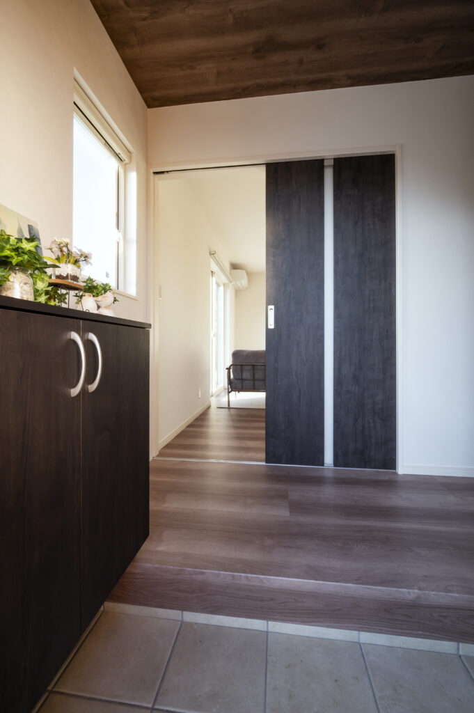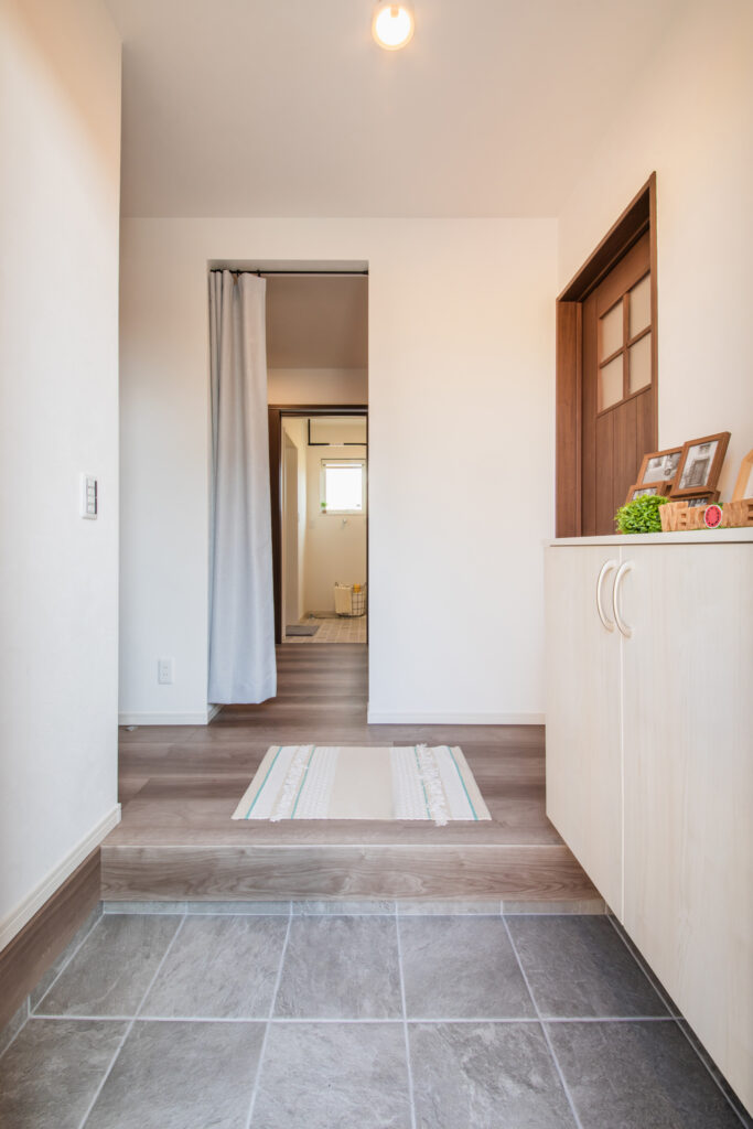 落ち着いたグレーのタイル土間とナチュラルな木目でまとめたエントランス。上がり框を上がると洗面・脱衣へスムーズに続く“ただいま手洗い”動線です。小窓付きの引き戸やカーテンでほどよく目隠ししつつ、玄関収納で見た目もすっきり。毎日の身支度と家事がはかどります。