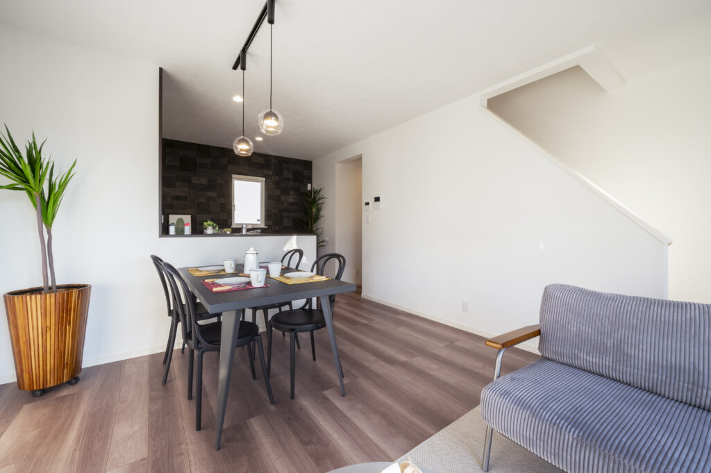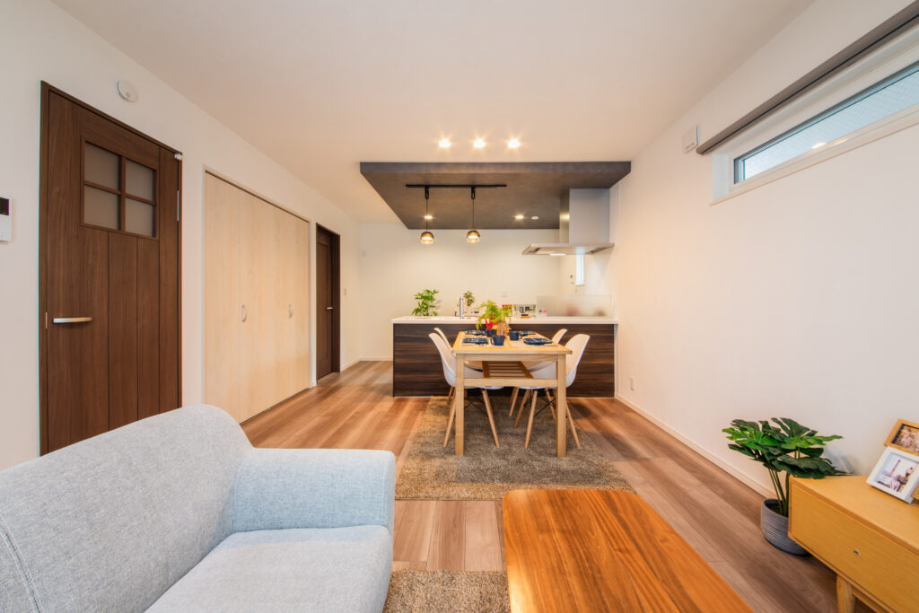 白壁にウォールナットの建具と木目床が映える落ち着いたLDK。ダイニング上はグレーの下がり天井とペンダント照明で雰囲気よく、リビング・ダイニングをラグで緩やかにゾーニング。ハイサイド窓が明るさを取り込みつつ視線を遮り、一直線の家事動線で毎日を快適にします。