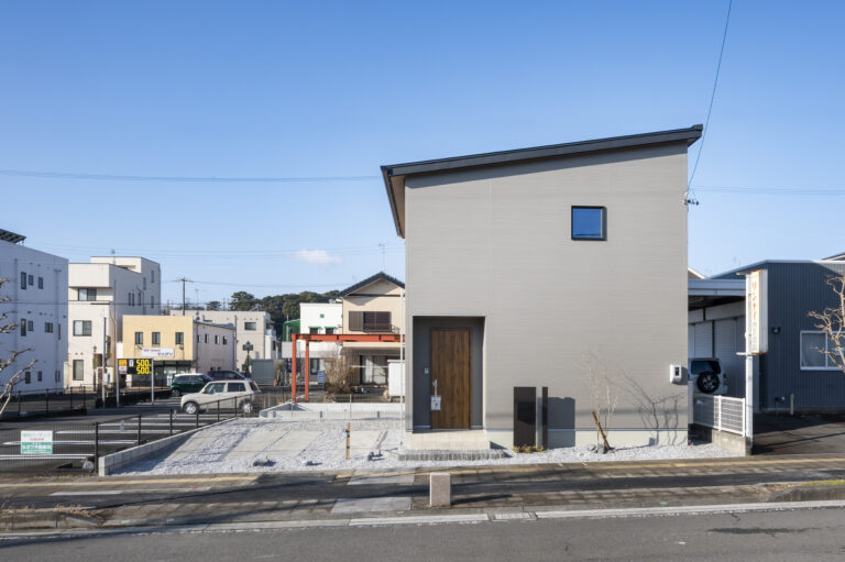 磐田市の26.55坪のキューブ型2階建て。シンプルな箱型外観と効率的な3LDKプランで、家族が心地よく暮らせる住まいです。