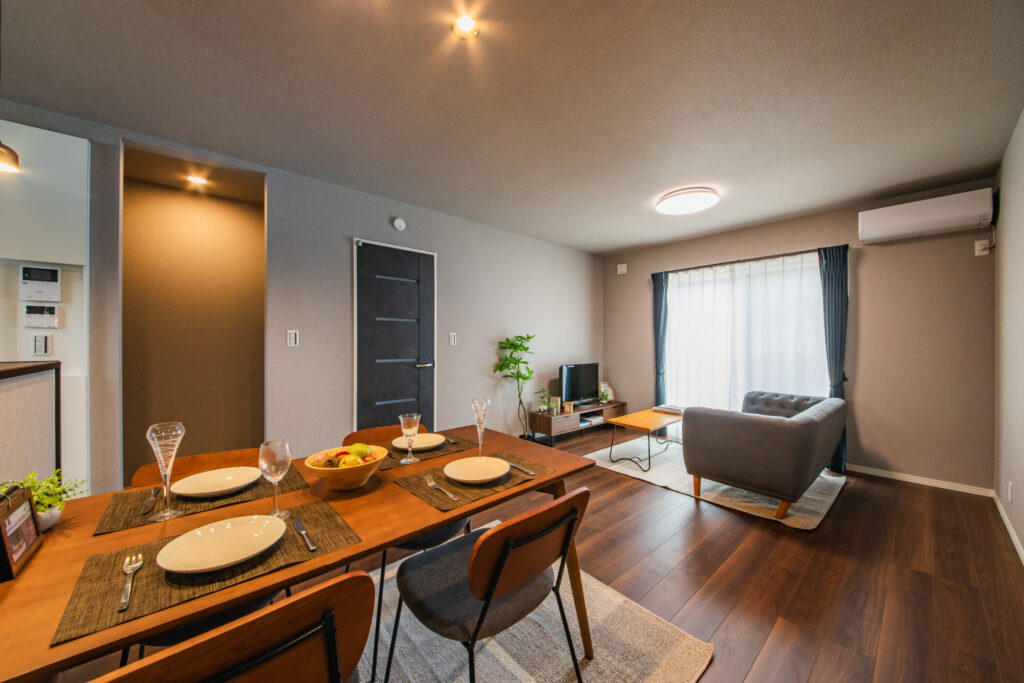 落ち着いたグレーの壁とウォールナット調の床が上質感を演出するリビングダイニングです。奥行きのあるダイニングセットとソファをゆったり配置し、間接照明とカーテンで柔らかな雰囲気に。食事も団らんも心地よく過ごせる、落ち着きのある空間に仕上げました。