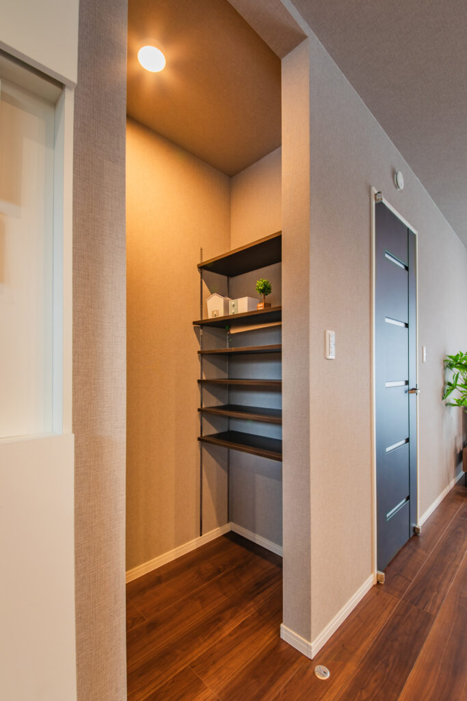 グレージュの壁紙とダーク棚板、木目フロアのコントラストが上品なニッチ収納。可動棚で高さ調整ができ、日用品から小物のディスプレイまで幅広く対応します。扉なしで出し入れしやすく、足元まで届く柔らかな灯りが廊下を心地よく演出します。