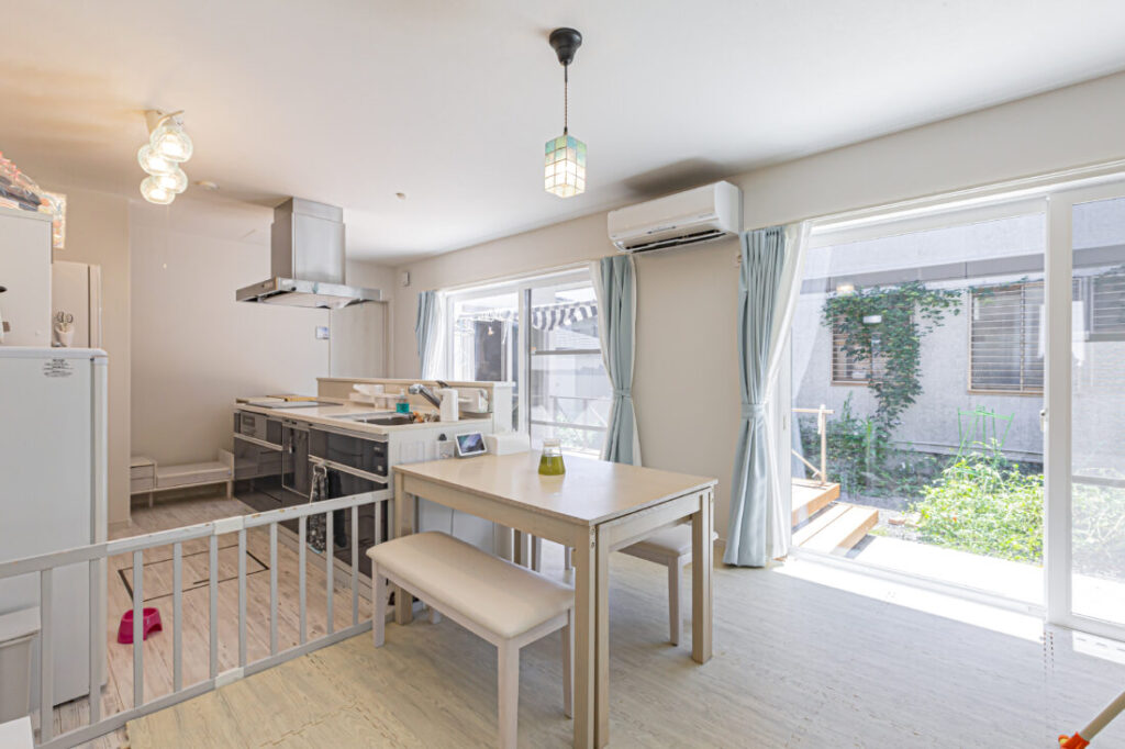 リビングからの大きな窓の明るさが、さらに過ごしやすい空間になっていて横並びダイニングの広さが活きています。