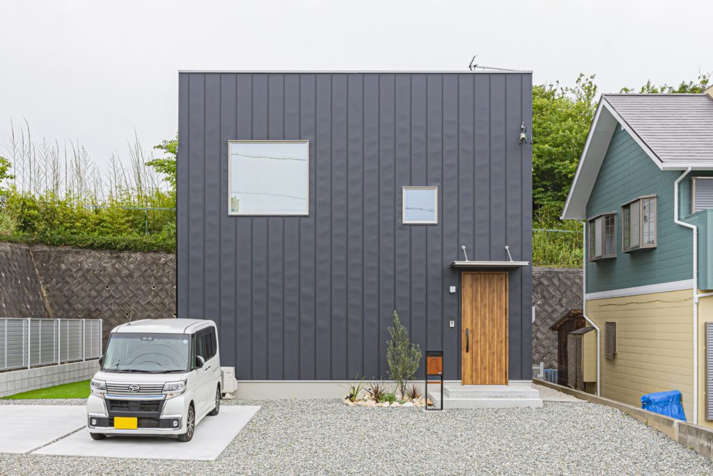 玄関ポーチの壁を他の部分と貼り分けることで、シンプルな外観ながらもかっこいい印象の玄関に。