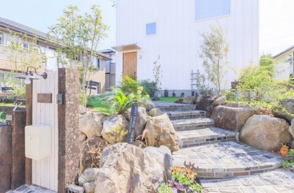 玄関ポーチに植栽やオブジェがあるだけで、印象は明るく変わります。