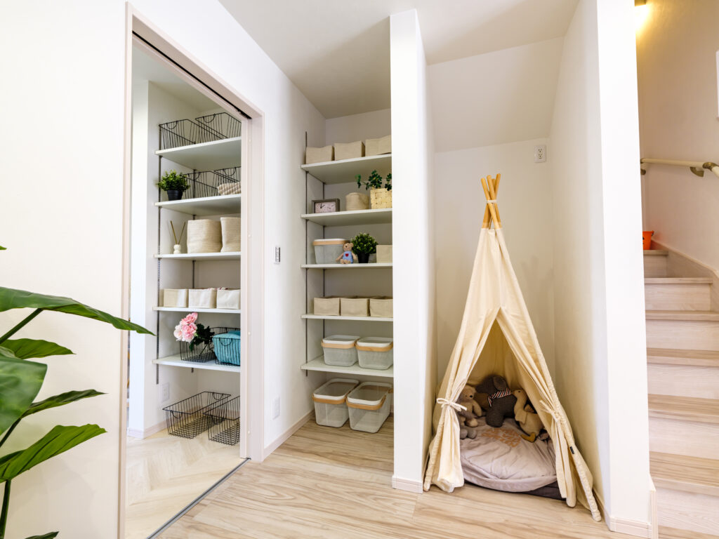 室内には子供が遊べるようにテントをはれるスペースがあるほか、収納棚が数多く設けられているのもポイントで、ファミリー層でもストレスなく快適に過ごせます。