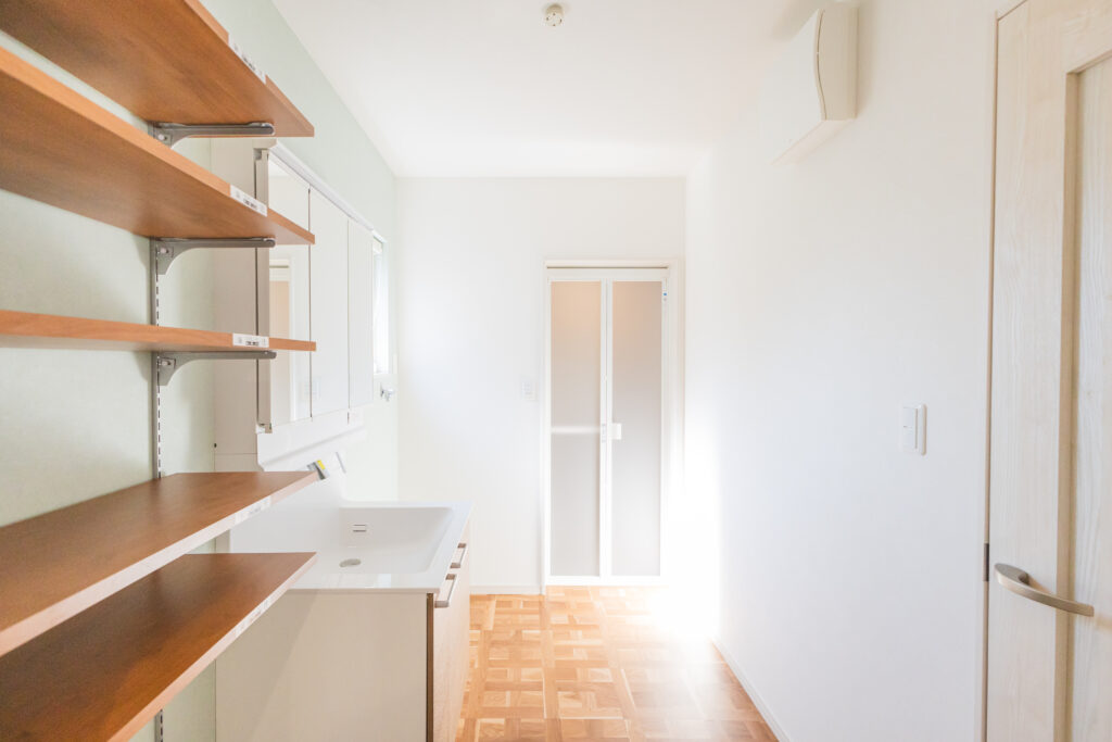 可動棚があるので収納しやすく、ランドリーとしても活用できる洗面脱衣室。
