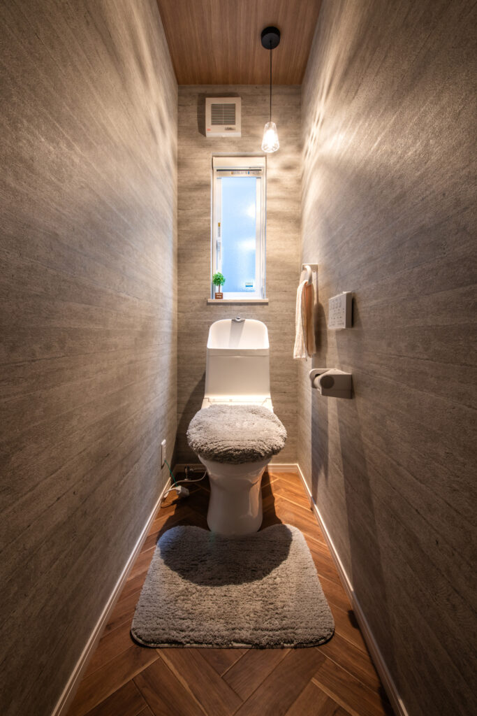 落ち着いた雰囲気にペンダントライトの光が映えるトイレ