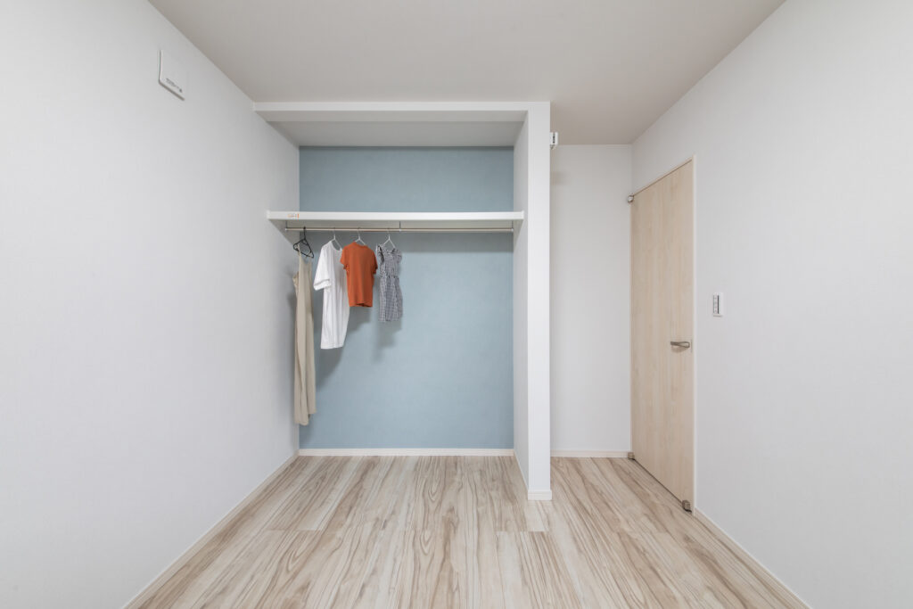 アクセントクロスが映える子供部屋、収納の扉をあえてなくすことで広い空間に